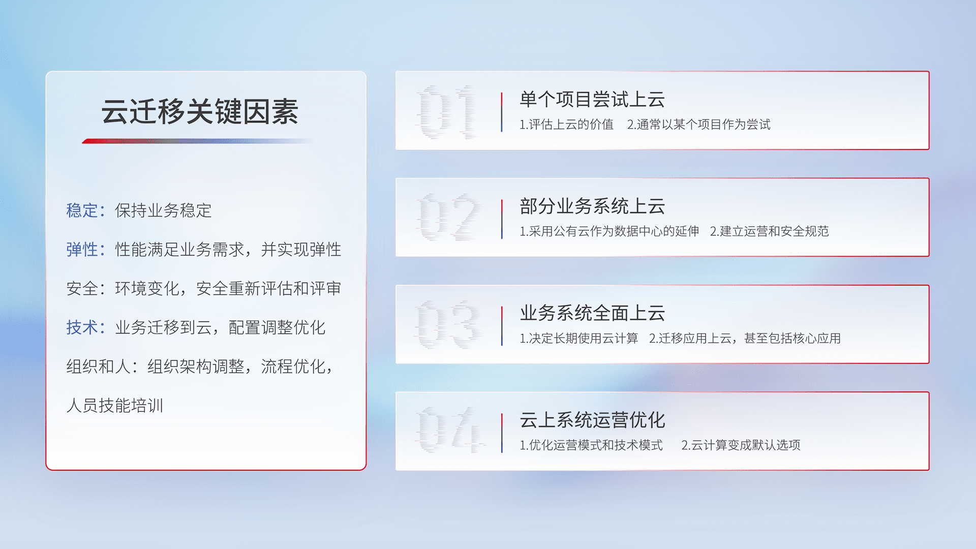 结合实际业务,,从规划设计、、、云平台选型、、、、云原生改造、、、、数据迁移、、集成交付,,,迁移全过程为客户识别最佳上云路径,,做好风险识别管理,,设计网络架构、、身份权限、、、安全审计合规、、操作审计、、、、日志审计、、、、监控告警策略、、、、多站点容灾设计等,,对云上基础设施进行整体规划,,,提升IT治理水平,,,以满足弹性、、、、高可用、、高性能的需求。。。。