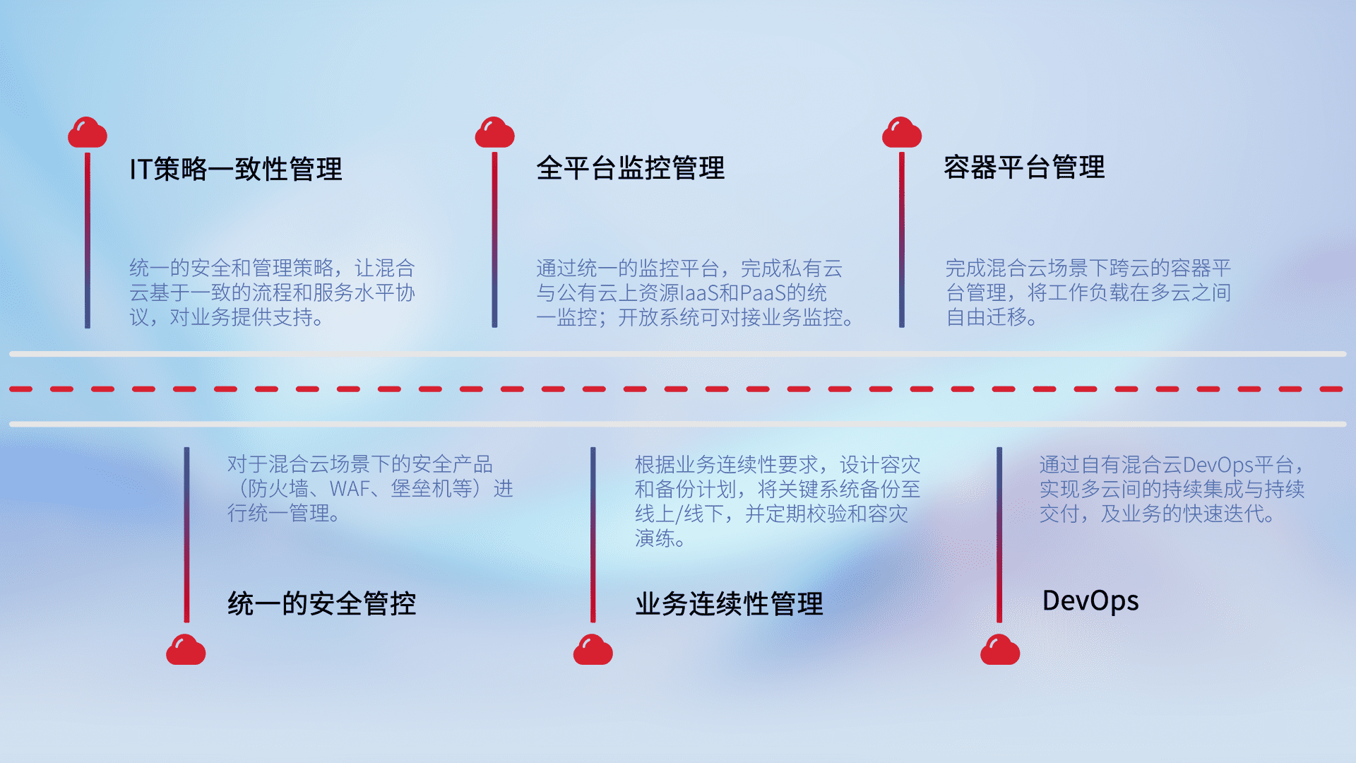 通过多云纳管,,,,以统一的资源数据模型把客户的云资源进行抽象和封装,,进而实现对多云资源的统一操作,,,,保障云资源管理的可靠性、、、、稳定性与可用性。。。量身定制化运维内容,,,,配置、、开发运维、、、、补丁管理、、备份、、、、监控、、、认证和访问管理、、、、审计和日常巡检等,,,保障在用云过程中的可靠度,,,稳定度以及高可用率。。。