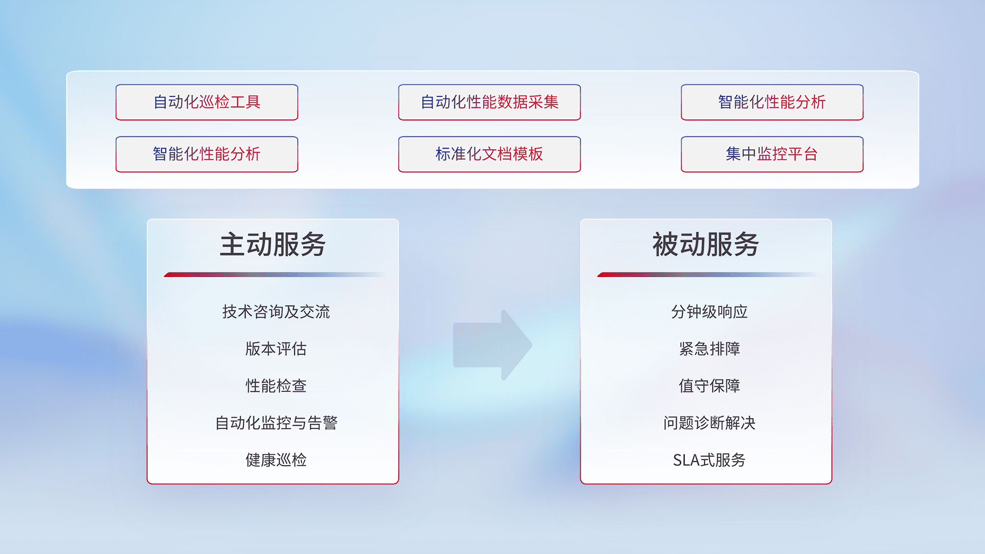 智能化工具和标准化文档,,,保障服务质量,,提供主动服务(包含技术咨询、、、版本评估、、、、性能检查、、、、自动化监控与告警、、、健康巡检)和被动服务包含(分钟级响应、、、、紧急排障、、值守保障、、、、问题诊断解决、、、、SLA服务)。。。