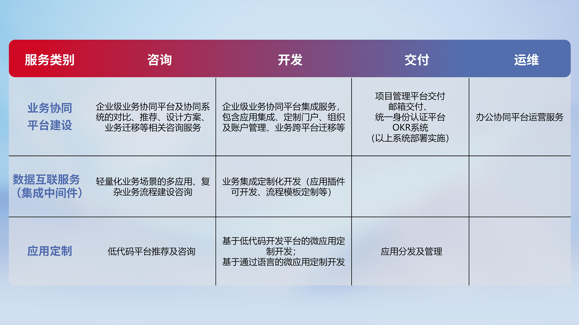 针对钉钉、、、、企微、、、、IDaas等平台级产品提供产品的规划、、、、方案、、、交付、、、定制化开发等服务,,,实现如统一协同办公、、、智能客户服务、、混合会议管理、、智能数据查询、、等业务场景,,,,实现数字化转型。。。